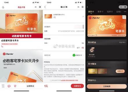 【必胜客1元开通免配送费月卡】微信打开地址->1元开通后秒到->必胜客每天免2次外送费,刚好需要的上