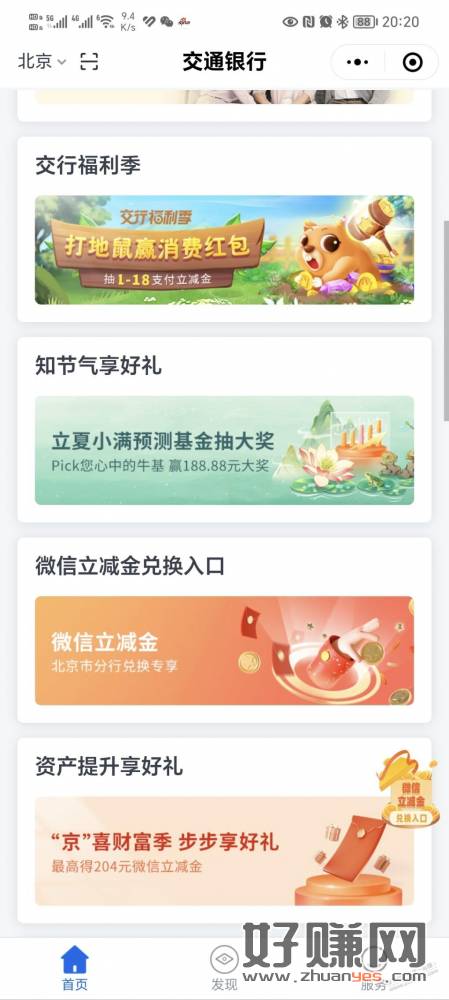 交通银行微信小程序,左上角定位北京,知节气享好礼,投票中了8.88。还有个打地鼠的活动,没玩过的玩。