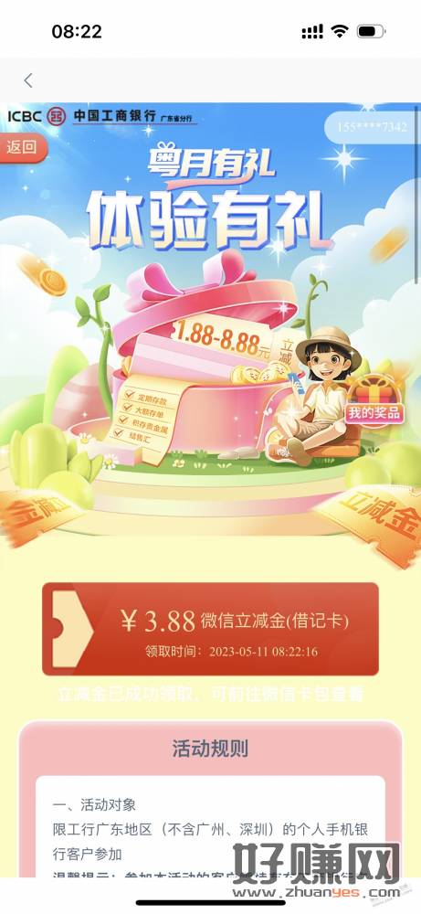 广东工行 粤月有礼 体验有礼 1.88-8.88立减金