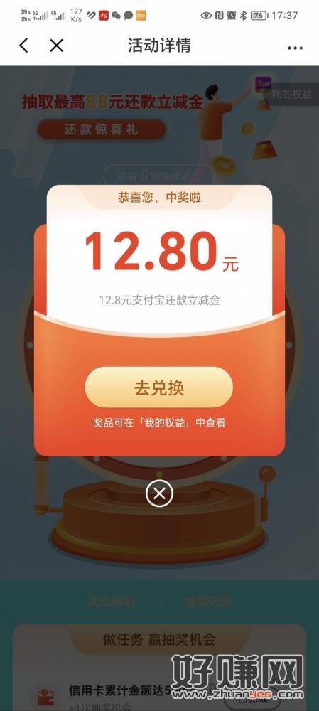 光大银行APP,权益,有个活动xing/用卡快捷支付超过500的抽奖一次,我中了12.88zfb还款金