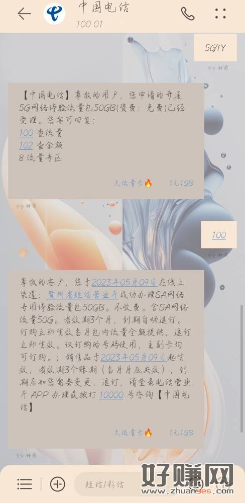 中国电信免费领50G流量 (江西成功了其他地区自测) 输入5GTY到10001即可