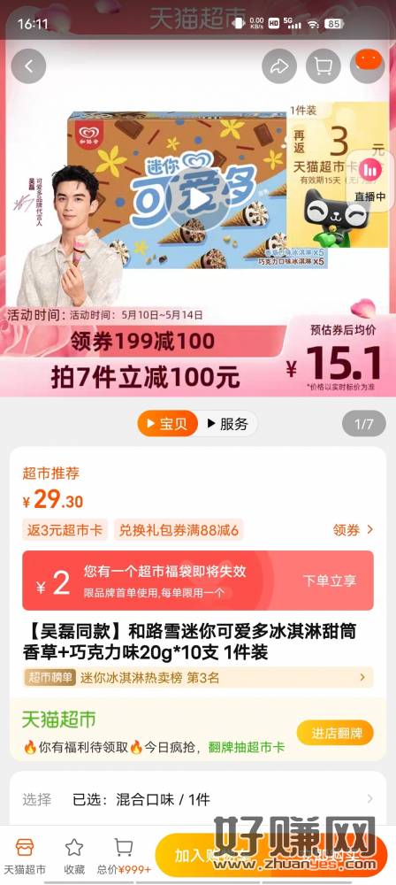 返利软件去搜跳转天猫下7件,领页面199-100返21猫超卡,加1元大米