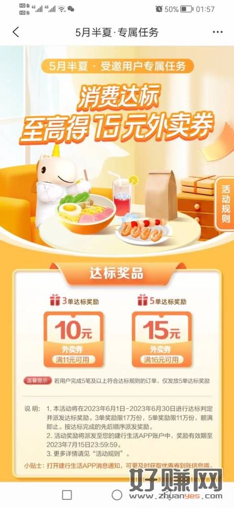 建行生活 受邀用户专享 自己看看横幅有没有这个,受邀用户刷5笔>10的订单,下个月可以领16-15的外卖券