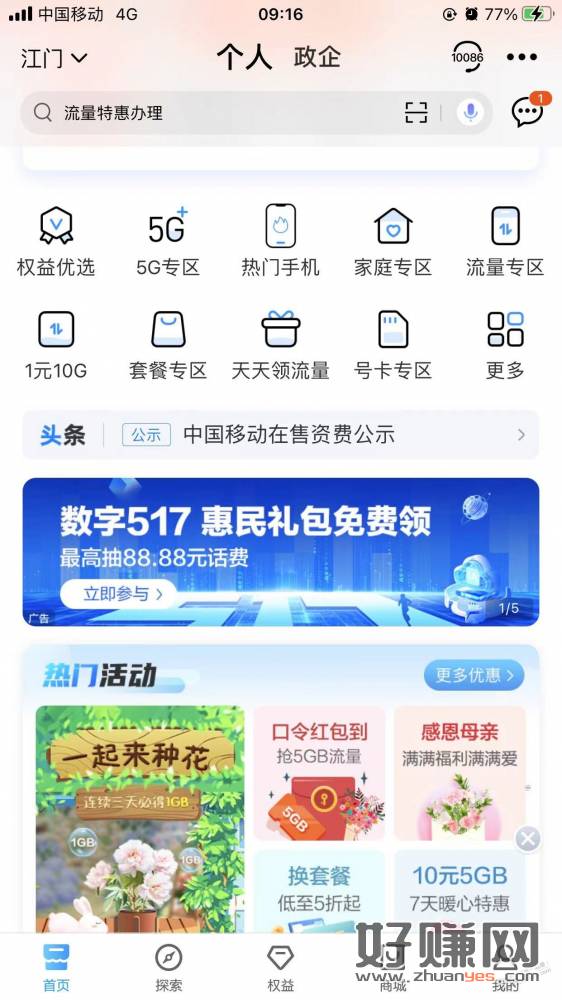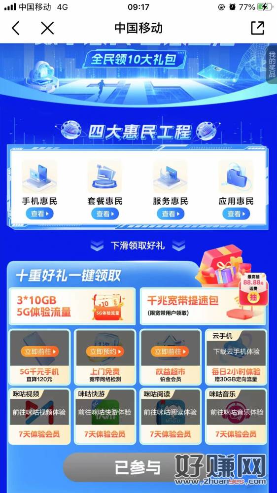 中国移动APP点横幅517数字礼包,领流量,宽带提速等等!还有权益超市铂金会员!应该是全国活动吧,广东肯定有!还可以点旁边那个88.88抽,有话费!不喜勿喷!好用加果!