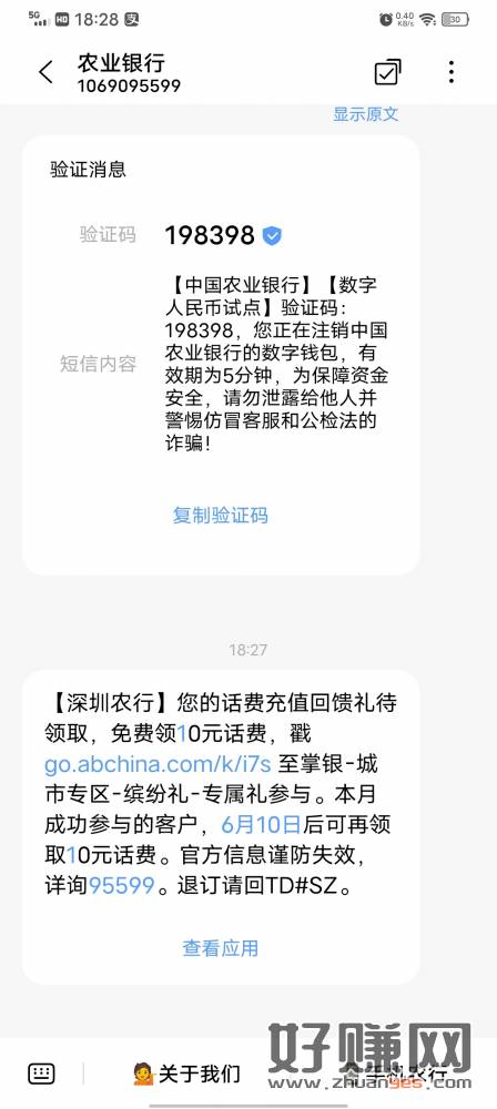 【深圳农行】您的话费充值回馈礼待领取,免费领10元话费,戳 go.abchina.com/k/i7s 至掌银-城市专区-缤纷礼-专属礼参与。本月成功参与的客户,6月10日后可再领取10元话费。官方信息谨防失效,详询95599。退订请回TD#SZ。