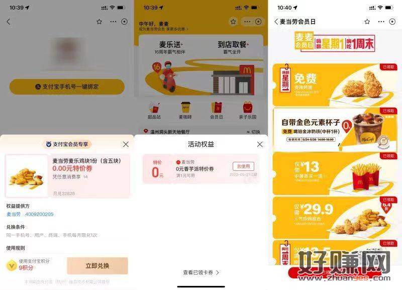 ①支付宝-我的-支付宝会员-搜索“麦当劳”9积分兑换麦乐鸡5块