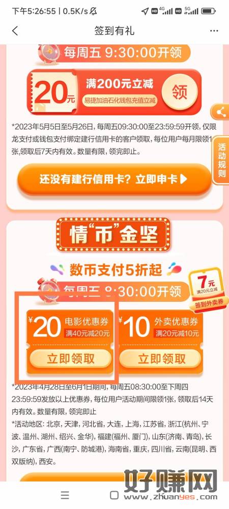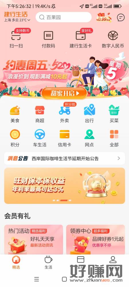 建行生活定位上海首页520横幅,点进去往下滑领取40-20电