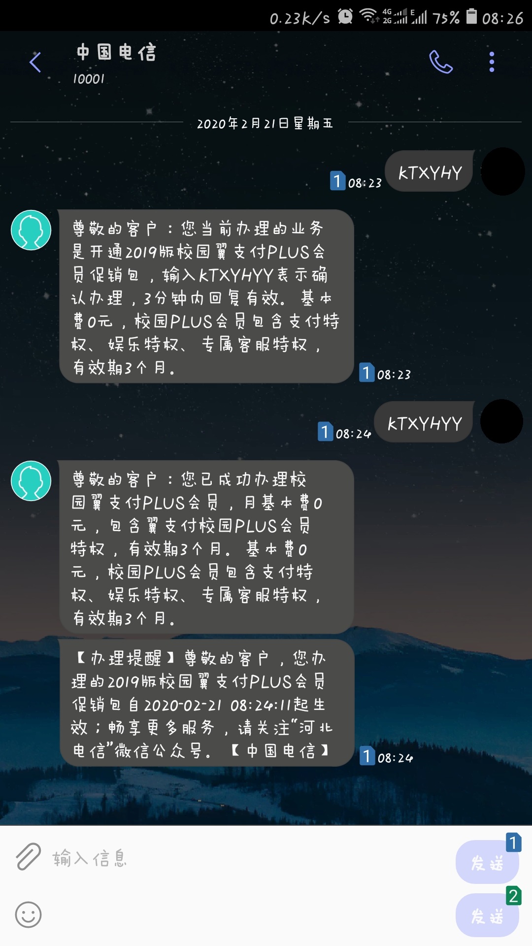 1.发短信KTXYHY到10001订购校园翼支付PLUS会员(免费,有效期3个月)