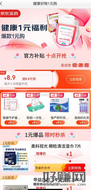 【京东健康1元撸实物包邮】打开活动地址领9.9减8.9元券->任选一个实物即可抵扣券1元包邮到手