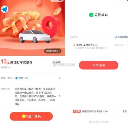 【微信5金币兑换高德打车10元券】微信打开地址->使用5金币兑换(金币不够就返回左上角首页领一下)->在高德打车小程序满11立减10元