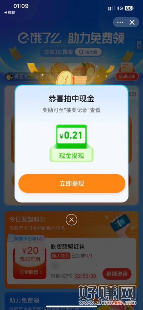 打开饿了么-我的-助力免费领-分享一次抽卡
