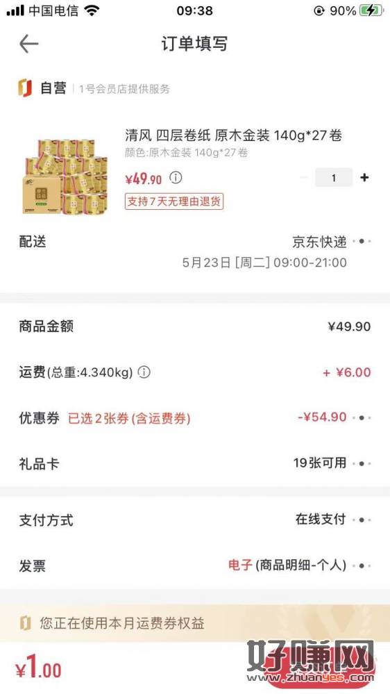1号店纸巾券到账了