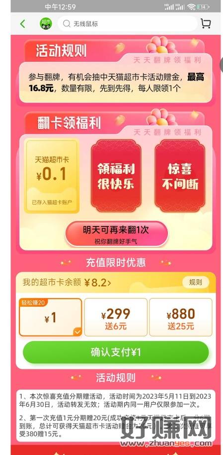 打开天猫超市首页停留一会,显示618大奖,领取跳转