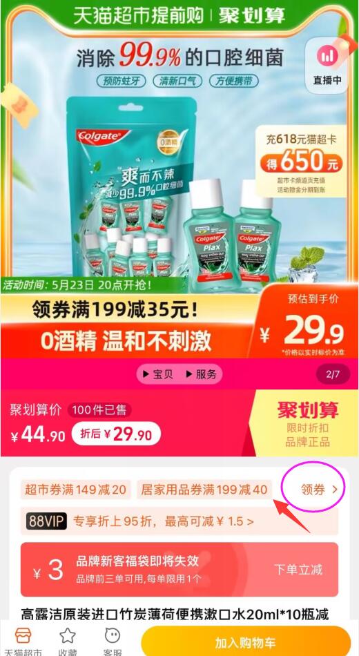 14.8元到手(用了3福袋) 199-40券居家购物券标题上领 1、领 券 加 车1件 高露洁薄荷漱口水20ml*10瓶