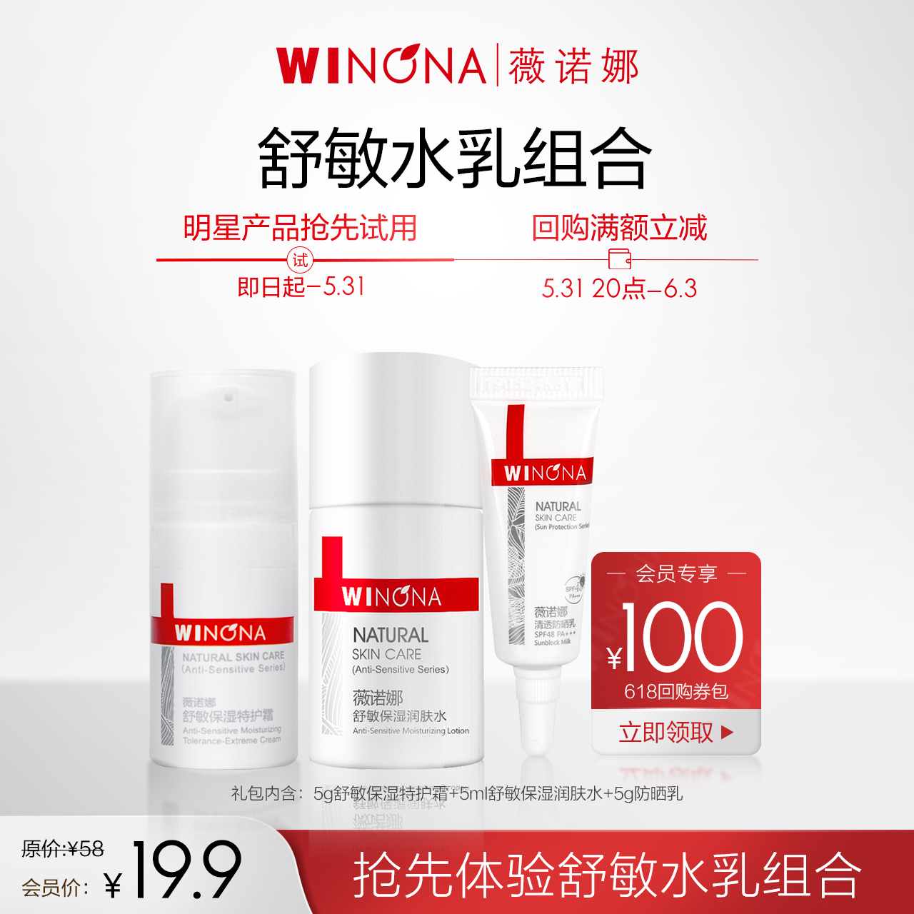 19.9亓 薇.诺娜试用,防晒5g+防晒乳5g+舒敏水5ml