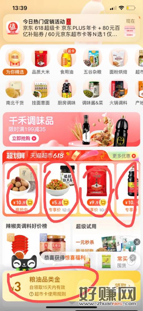 天猫超市每日签到累计1通用猫卡,天猫超市进粮油调味分区弹3品