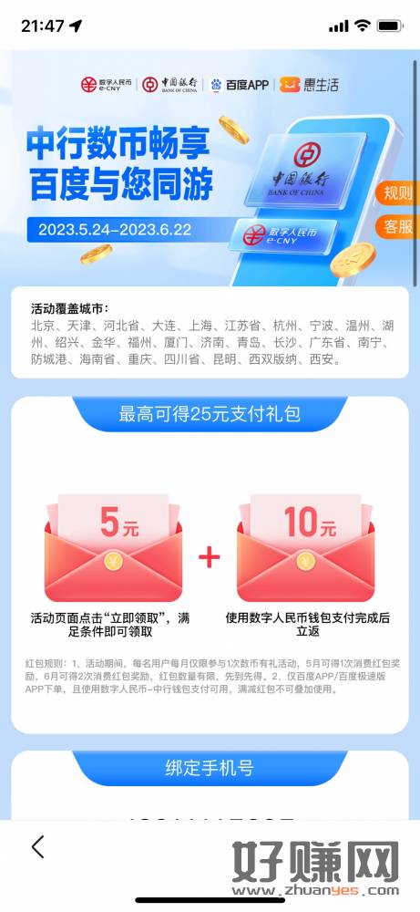 速度 百度app 我的 钱包 领取中行数字人名币5块 消费了立返10 注意定位图一城市,限设备,一个手机只能领一个号