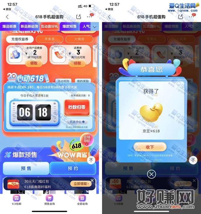 微信/京豆扫码打开下拉至【心动618】点【开始计时】摁到 6.18秒 有618京豆