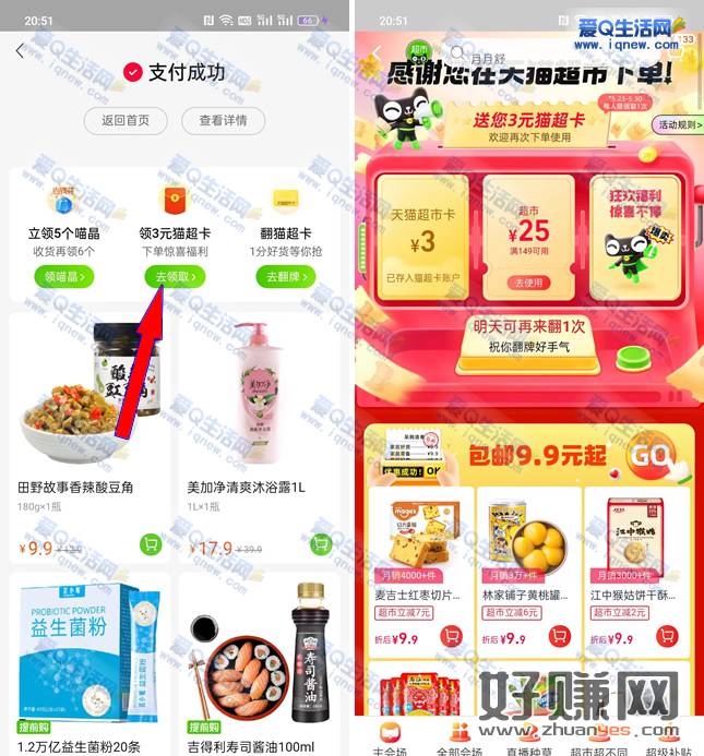 是先去用5.9元购买天猫超市的漫花抽纸4包,买完就会有领3元猫超卡的活动