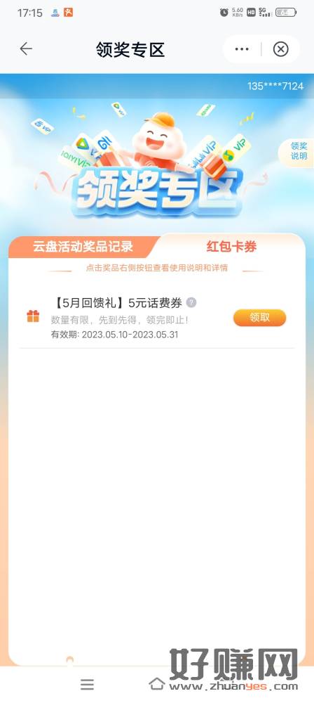 或登录各大应用市场下载移动云盘APP,云盘天天用,福利月月领。有收到这个短信的去移动云盘我的领奖专区领取5话费。