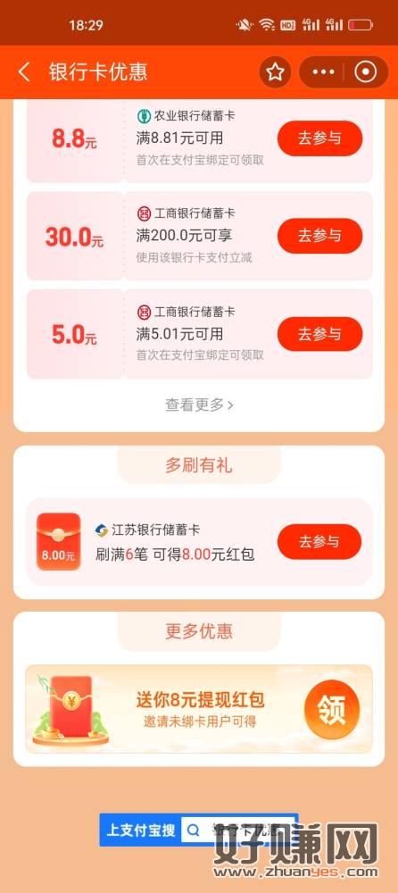 支付宝打开,搜索银行卡福利,拉到底,有江苏银行的去