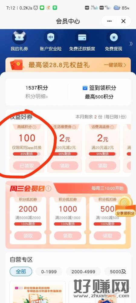 ZFB,会员中心,嗖[ 中行 ] 99积分兌2中行红包