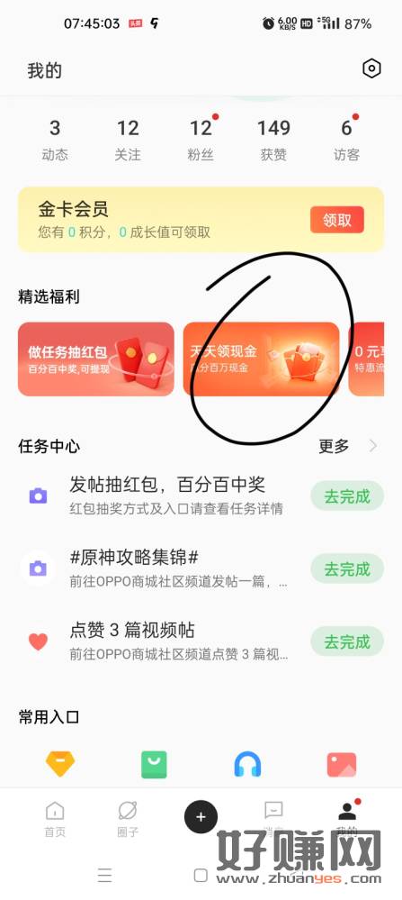 OPPO钱包用户,打开OPPO自带的OPPO社区APP,点击黑圈的位置,签到领0.4元,OPPO钱包提现,真我下载一个OPPO社区也能玩,需开通真我钱包才能提现