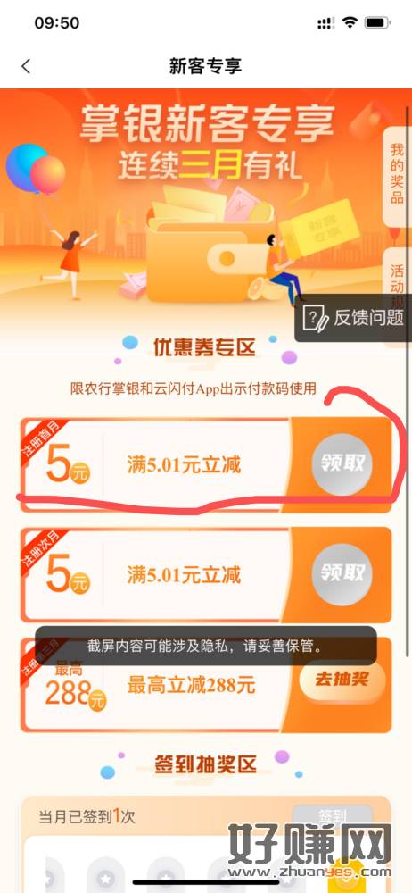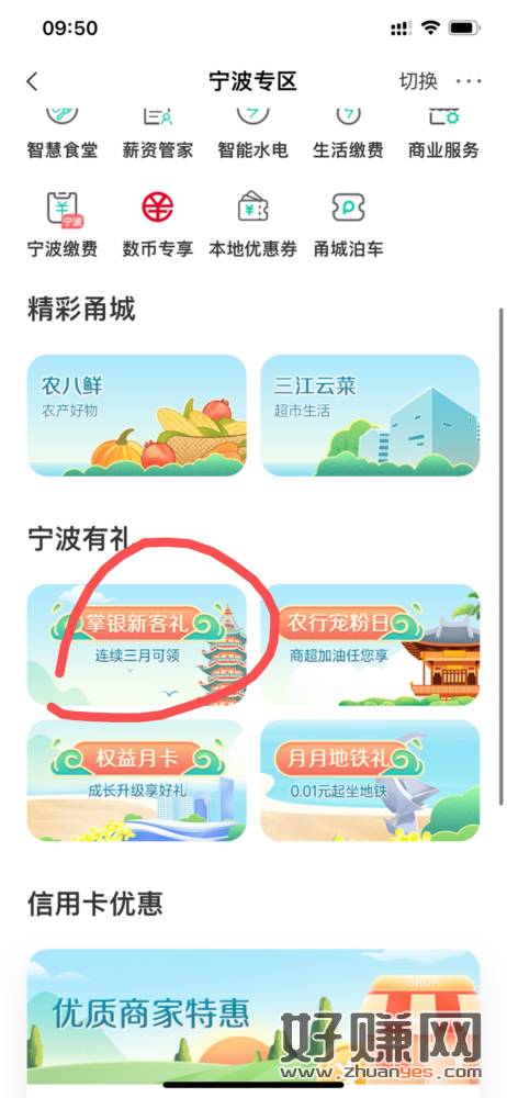 城市专区 宁波有礼 掌银新客户礼,这个月五元,下个月还有五元,绑定农行到云闪付再进来领取