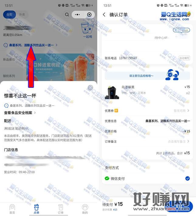 微信搜索【茶百道】小程序-去自取点单-顶部提示买一赠一指定饮品,去参与购买结算会立减