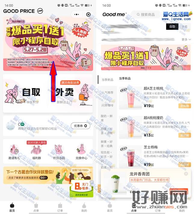微信搜索【古茗】小程序-顶部滚动横幅【爆品买1送1】,古茗活动是明天开始