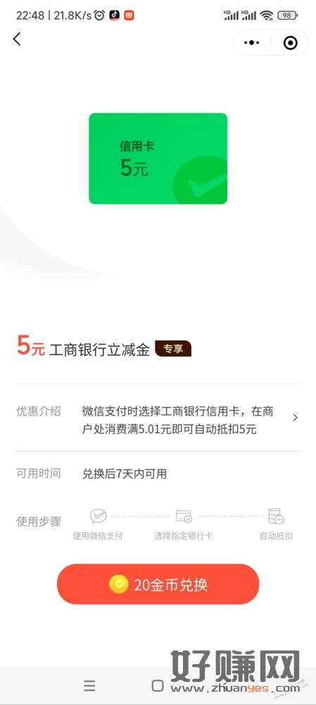 Vx 支付有优惠 20金币 兑换工行xing/用卡5.01-5立减金