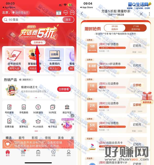 这个活动是在联通APP里面去参加,去页面抽奖和抢话费抢优酷月卡/酷狗月卡是三网都可以参加