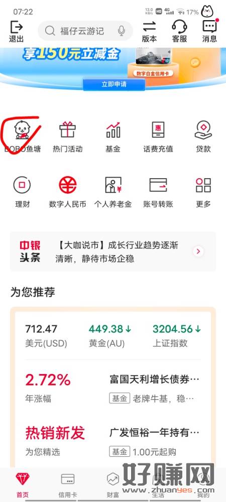 中国银行APP 搜索BOBO鱼塘 15号凌晨抢立减金或实物的