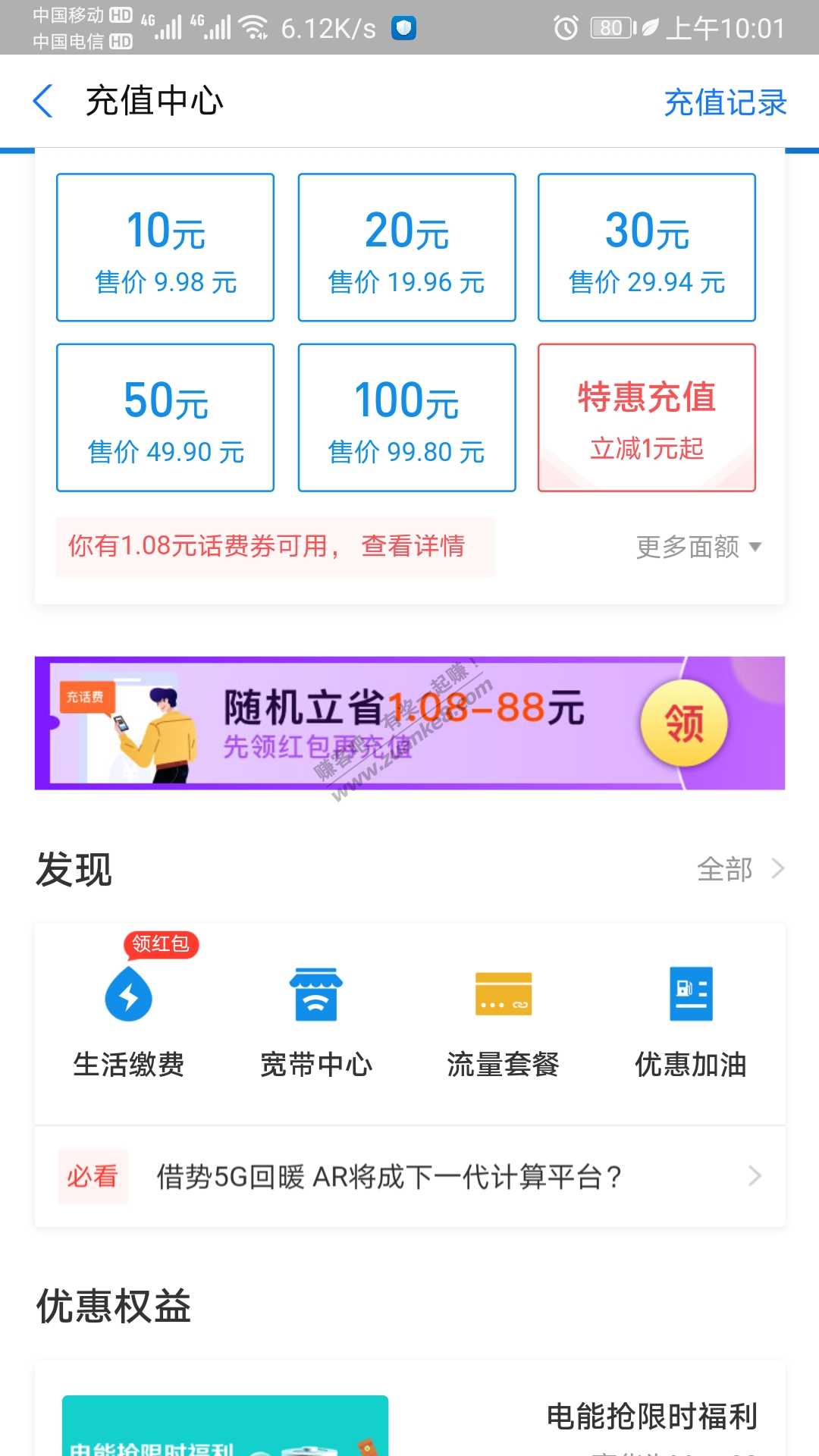 支付宝,充值中心打开 下面有一个随机立省1.08-88点进去点开红包领取就行,冲花费选择工行自动减
