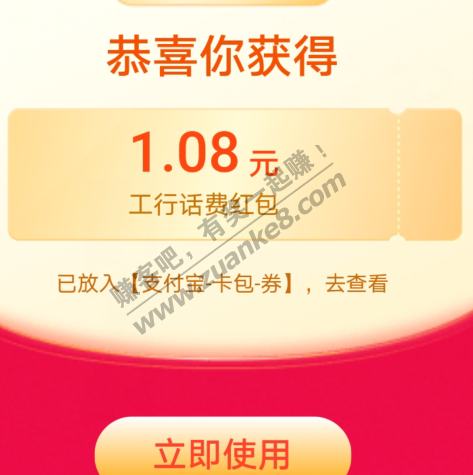 支付宝工行话费毛1.08-88[ 部分人有 ]
