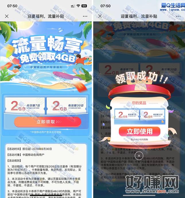是移动用户的可以去参加一下这个活动哦,可以免费领取2个2GB的流量券