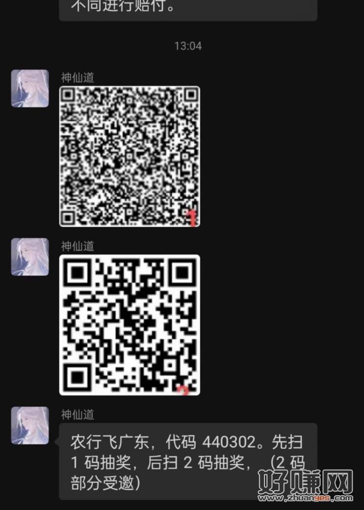 农行飞广东,代码440302。微信先扫1码跳转抽奖,后扫2码抽奖,2码部分受邀。