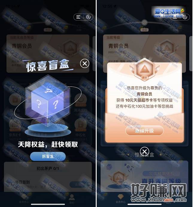 完成浏览任务/查询任务/理财任务都可以升级会员等级,等级越高奖品就越好