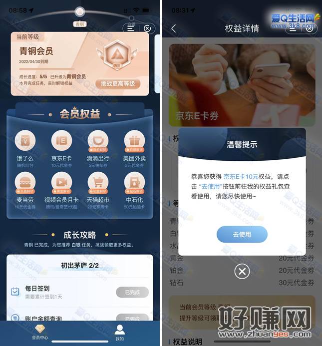 2.完成成长攻略里面的5项任务即可升级为青铜会员,可领取一张10元的京东E卡,直接立即去使用复制券码去京东兑换即可