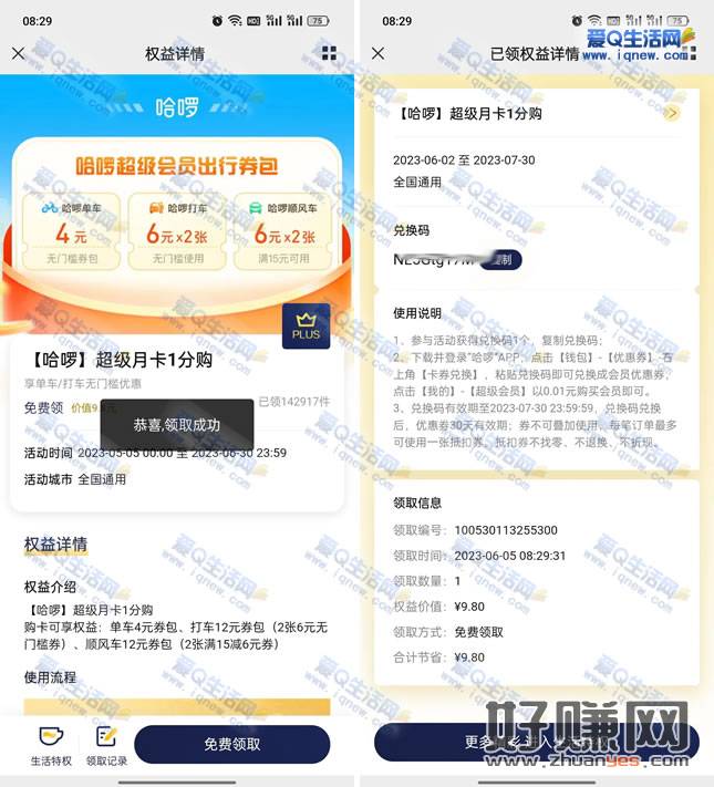 哈啰超级会员月卡可享权益:哈啰单车4元无门槛券包、2张6元无门槛打车券等