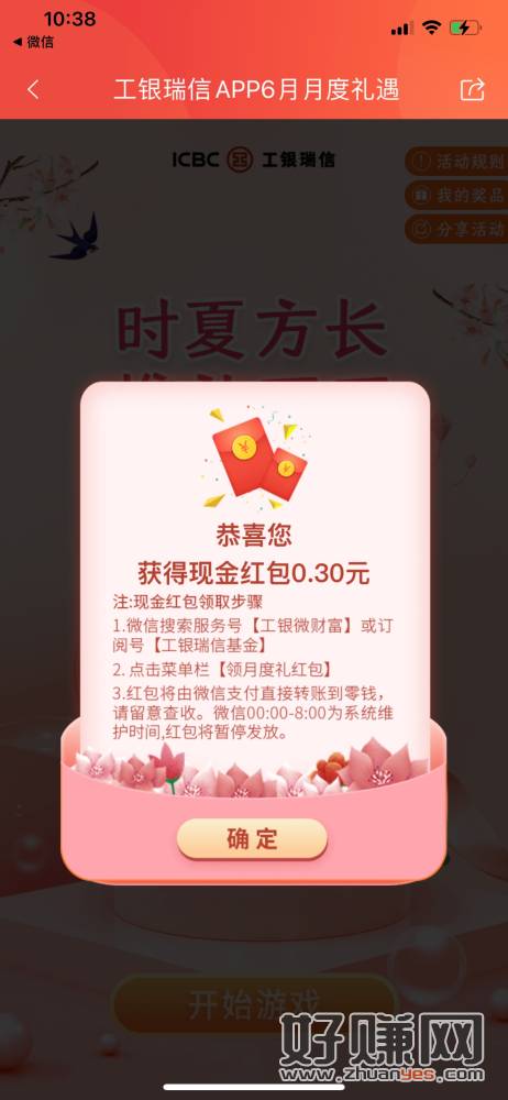 微信公众号【工银微财富】点菜单栏【福利活动】-【月度礼遇】领取秒到微信零钱!