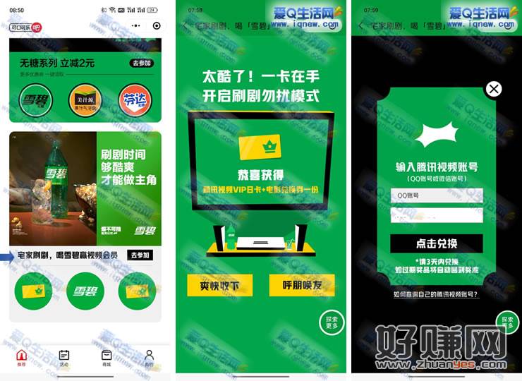 微信打开下方小程序-下拉至【宅家刷剧 喝雪碧赢会员】-选择你想要看的剧开奖即可-一天有2次机会-充值到QQ账号才会成功