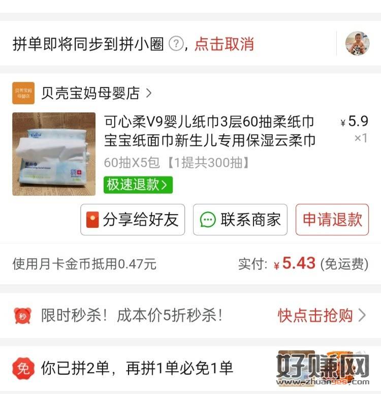 拼多多,可心柔v9,60*5包,5.9元,使用单单省5.4元