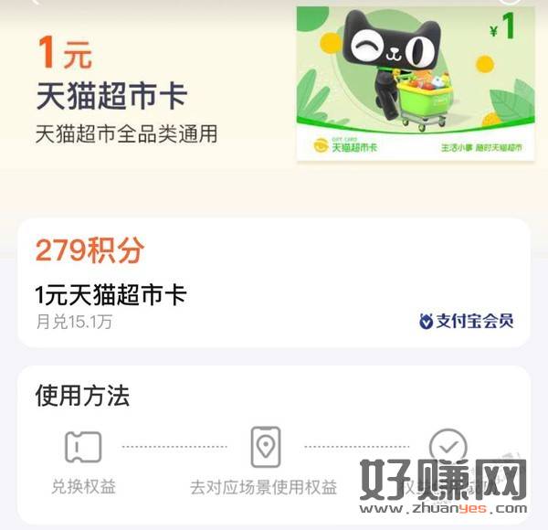 支付宝,积分兑换 ,279积分兑换1元天猫超市卡