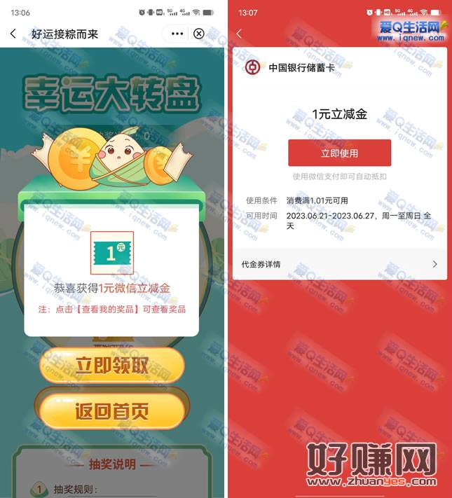 中行好运接粽而来抽1-9.9元立减金 亲测1元秒到