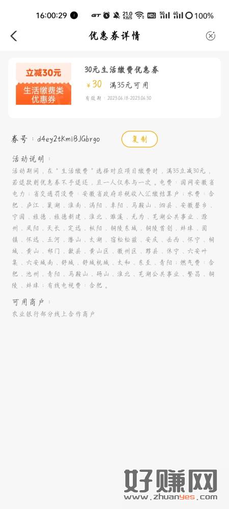 安徽农行-缴费券:看一下自己有没有,有的话应该可以冲电费,我5冲35电费