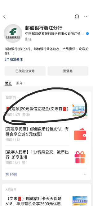 邮储银行浙江分行公众号 破定位浙江(除宁波) 抽立减以及e卡 好运苟冲!