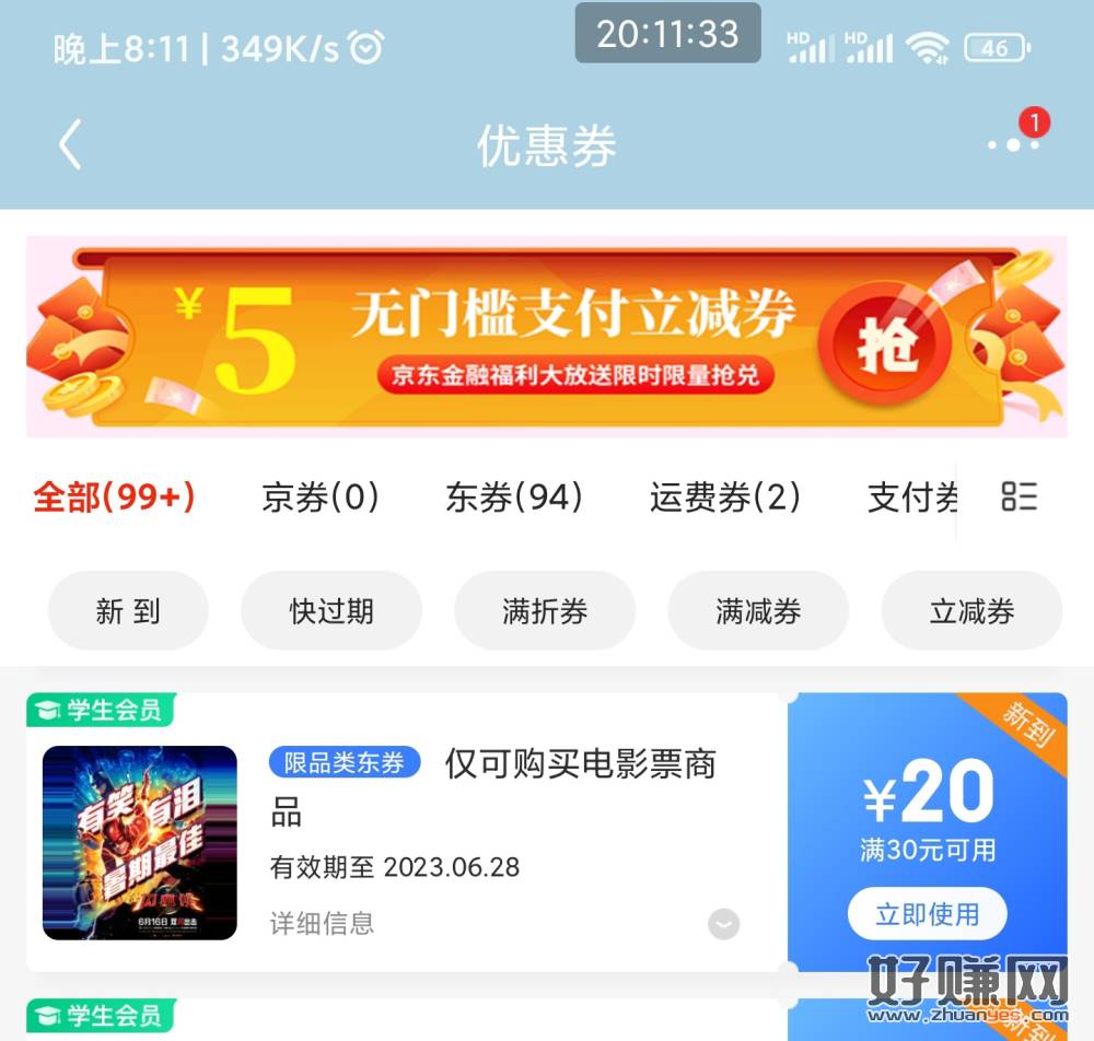 润10 京东学生会员可领30-20电影券 咸鱼出掉即可