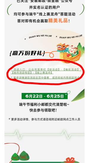 速度!快快快!! 全宇宙首发 关注安徽邮政-微金融公众号 入口红⭕️图1:右下邮活动—精彩活动—城市专区活动—赛龙舟