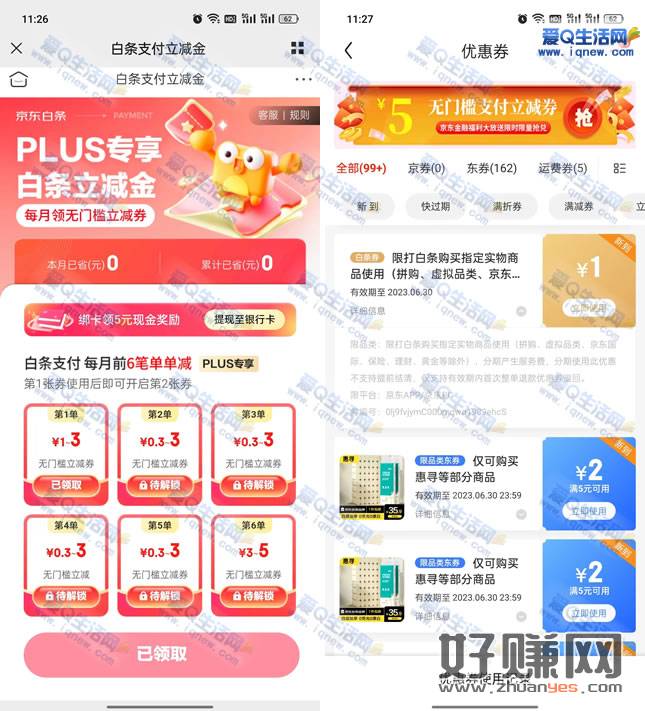 每月可以领6张最少是有5元,需要用完第1张券才可以领取第2张哦,亲测1元白条券秒到